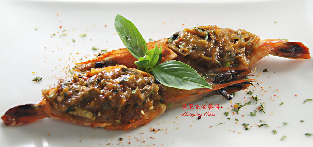 先將蝦子由頭部與背部的地方,用剪刀剪至尾部(不剪斷)去除腸泥,讓蝦子呈現兩半(不斷喔)撒上白酒與黑胡椒略為按壓一下蝦身(備用)