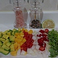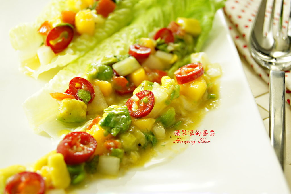 主要食材:將蘿蔓洗淨,放入冰箱冰鎮,再將酪梨,蕃茄,芒果,洋蔥,辣椒,切成丁,蒜仁,香菜切細末