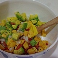 準備一個容器將酪梨,蕃茄,芒果,洋蔥,辣椒丁,香菜,及所有的調味一起放入拌勻